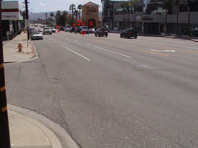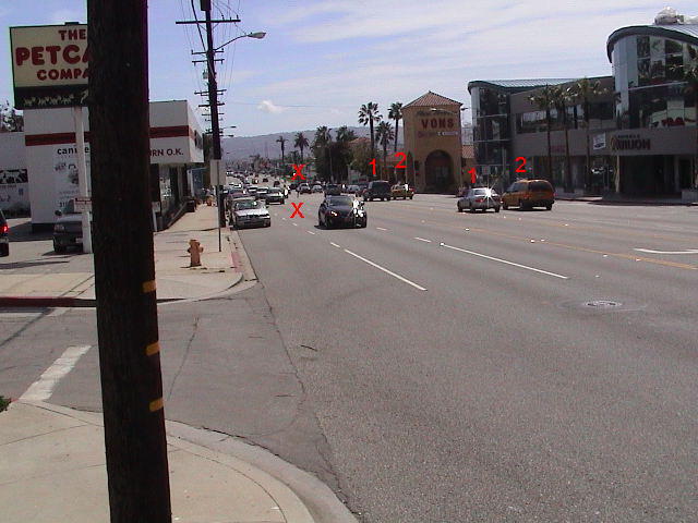 In the above picture the pedestrian has moved in front of the stopped vehicles in the southbound PCH lane 1 and lane 2. The two red "X's" mark the crosswalk area where the pedestrian was.