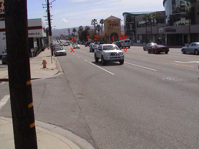 The red number "2" shows the vehicles in the southbound PCH number 2 lane, the southbound number 2 lane is just to the right of the number 1 lane in this picture.
