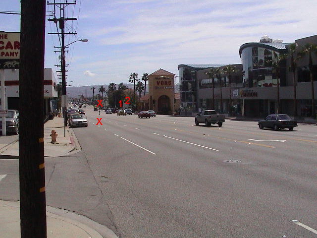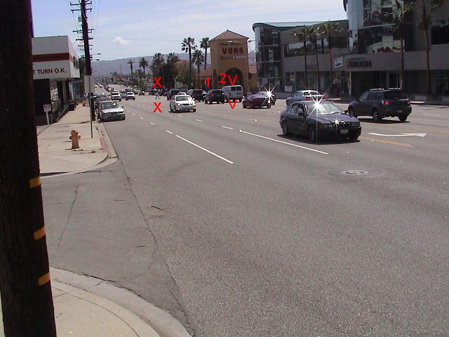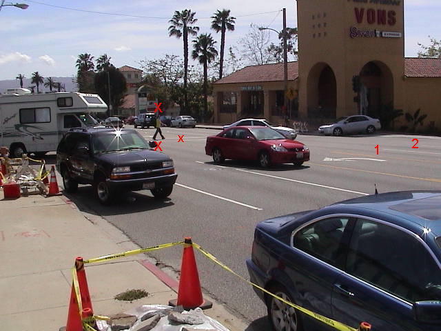 In the above picture the pedestrian has moved in front of the stopped vehicles in the southbound PCH lane 1 and lane 2.  The two red "X's" mark the crosswalk area where the pedestrian was.