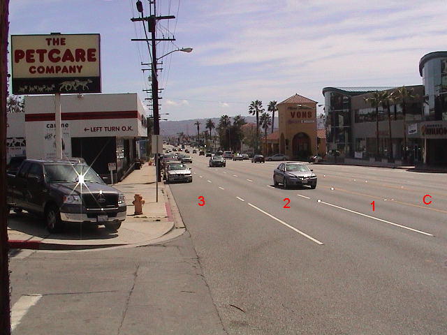 The red number "2" shows the vehicles in the southbound PCH number 2 lane, the southbound number 2 lane is just to the right of the number 1 lane in this picture.