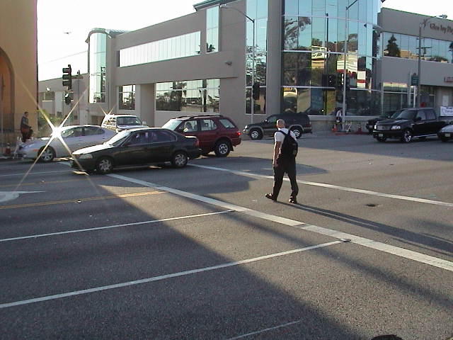 He made it across two crosswalks and now heads to " 24 Hour Fitness "